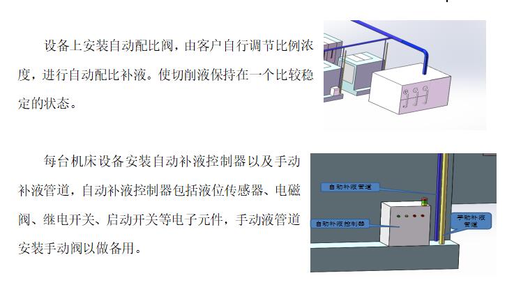 3、每臺(tái)機(jī)床水箱單獨(dú)安裝液位傳感控制系統(tǒng),實(shí)現(xiàn)切削液自動(dòng)補(bǔ)給功能。